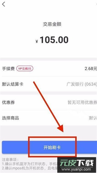 3. 在该页面可选择收款银行卡、查看手续费等明细,确认后点击开始刷卡。