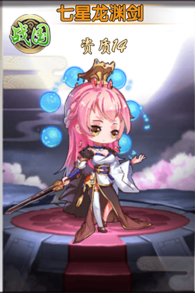 游戏中的七星龙渊剑是一个持剑英勇的女性角色,设定类似花木兰,身边有6颗类似能量球的圆形物体,略带忧郁的眼神仿佛藏着什么难忘的心事。