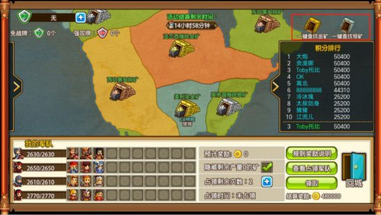 3. 资源矿场每日上午8点刷新,玩家可以在地图上直接选择想要攻占的矿点,也可以使用界面右上角的快速查找功能,直接搜寻可攻击的金矿或银矿,界面右侧会实时显示玩家的当前积分排名;