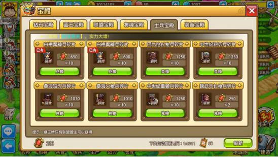 3. 升星需要消耗金币、红玉牌或对应的兵种碎片,多数情况下,碎片主要通过红玉牌在士兵宝殿中兑换获得,该功能在玩家35级解锁,点击兵种升星界面显示的蓝色加号即可快速跳转;
