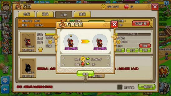 2. 玩家可以在兵营内为已拥有的兵种进行升星操作,升星后兵种的生命、攻击、力量等基础属性将获得显著提升,每个兵种最高可升至5星;