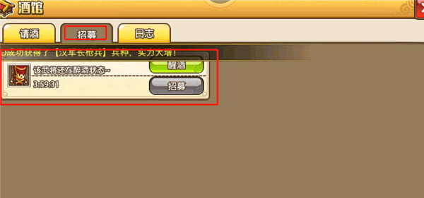 猜拳胜利后,武将会暂时进入【招募】列表,需要等待一段时间才能正式加入,可以使用道具“解酒药”来缩短等待时间。
