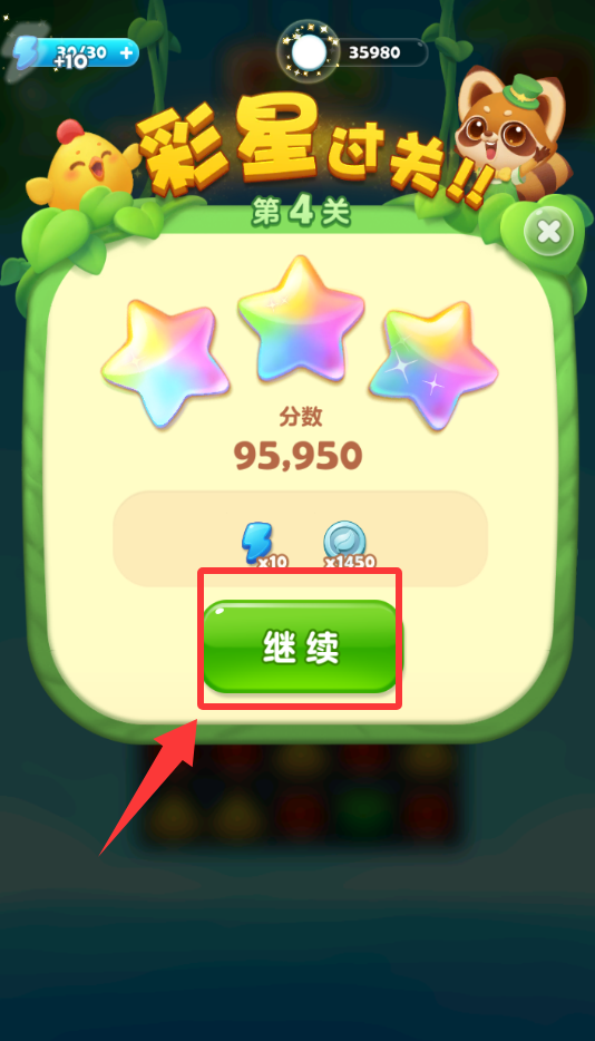 3. 成功通关后,画面会显示祝贺信息,点击图中红色框内的按钮即可继续挑战下一关。
