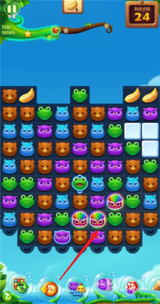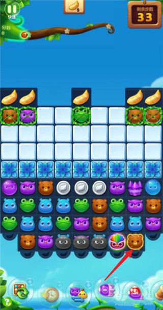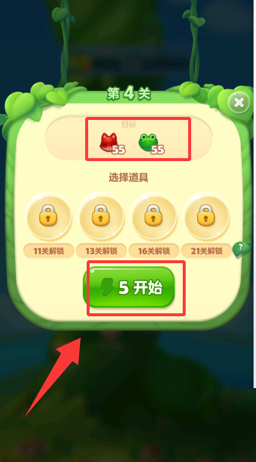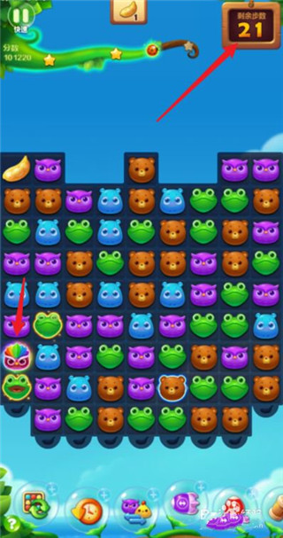 2. 开始游戏后,本关目标是消除55个青蛙与狐狸,达成数量即可过关。