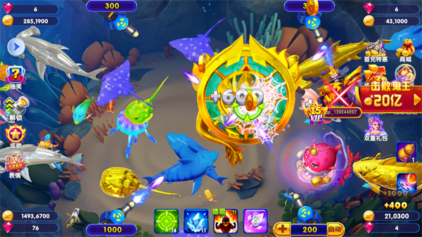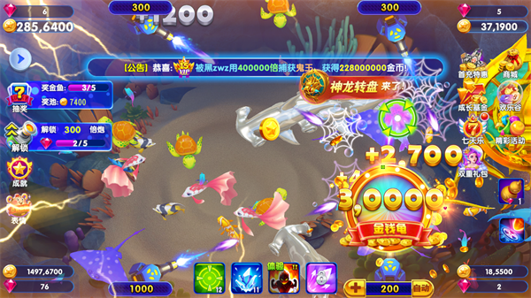 2、渔场金币获取:渔场是玩家最常接触的场景,也是金币的主要来源地;这里遍布各种鱼类,通过技巧可获得大量金币。
