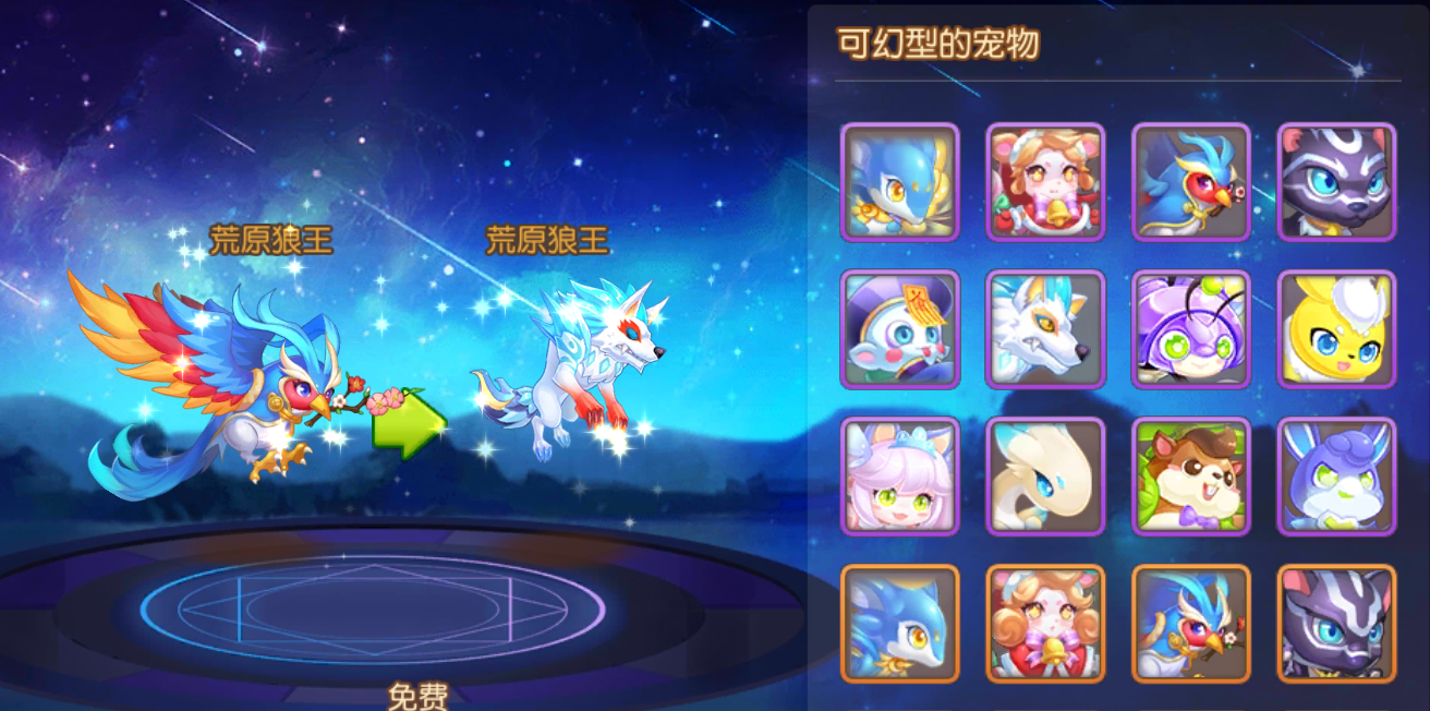 宠物支持幻形、重生与回收功能。幻形可通过消耗药水改变宠物外观,若想恢复原貌,只需在幻形界面重新选择原始宠物即可免费还原。