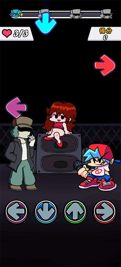 节奏对战最新版本是走卡通画风的音乐休闲类游戏,它的全称是黑色星期五之夜:节奏对战,玩法有独属于自己的特点,上手门槛不算高,游玩时跟着音乐节拍依次点击上下左右四个按键,就能完成整首曲目的节拍敲击,只有音符落到判定区的时候点击才算有效击打,点击的精准度越高,最后能拿到的分数也就越高。
