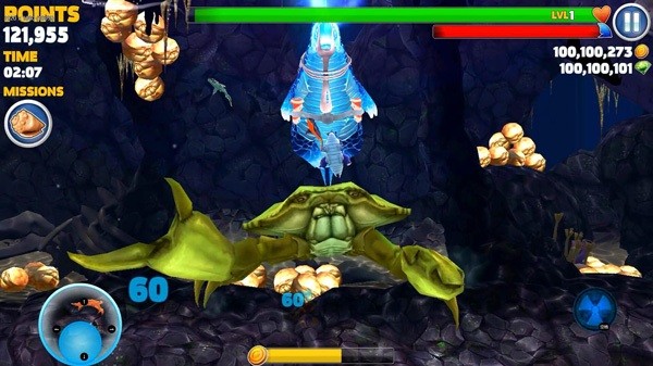 3、对准螃蟹的弱点部位发起冲刺攻击,攻击成功之后,螃蟹会暂时逃开,玩家可以操控鲨鱼到周围区域捕食补充状态,之后马上返回战场。循环操作几次之后,就可以击败巨型螃蟹。