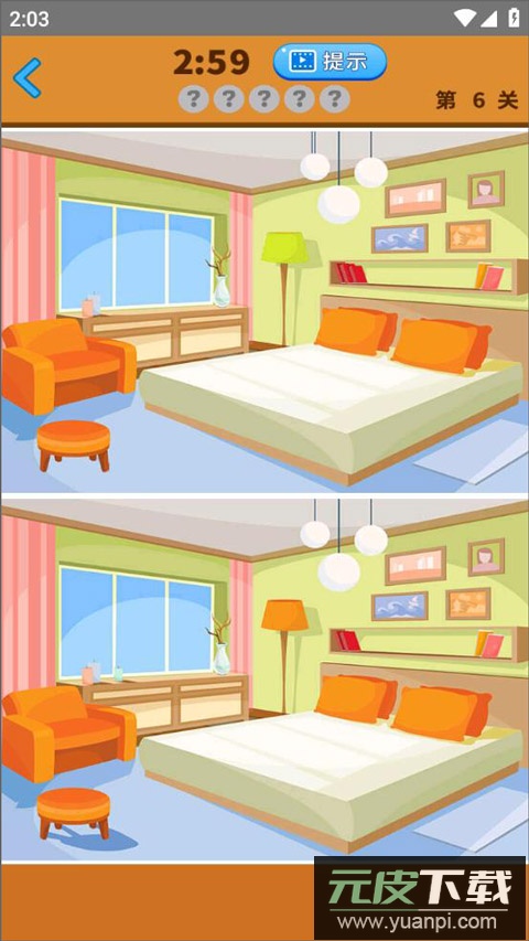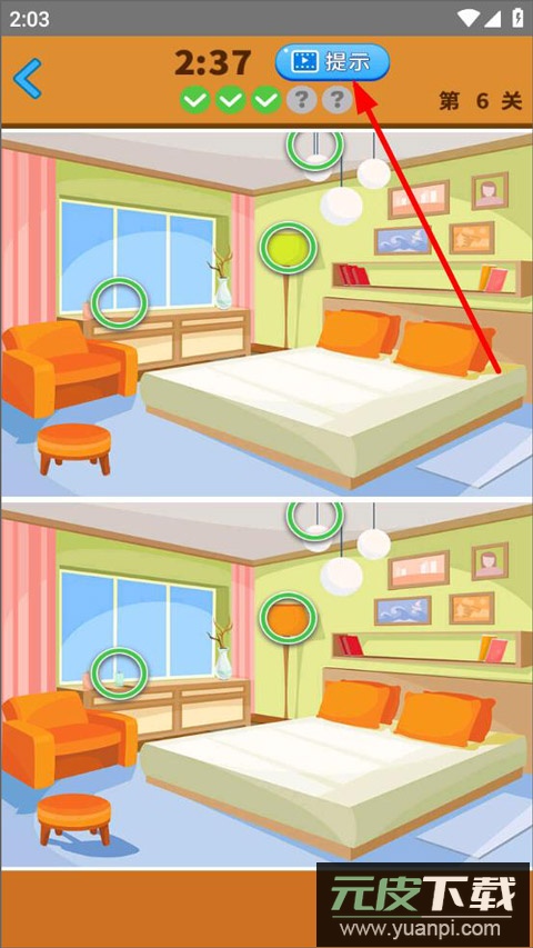 若某些差异难以发现,可使用界面顶部的提示道具,系统会为你标出一个不同点。