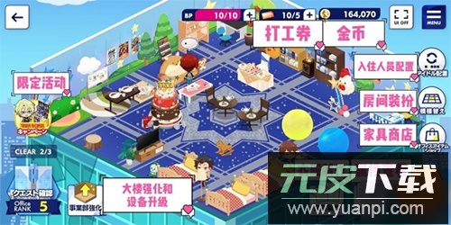 除了人员配置、房间装饰与家具商店这些基础功能,玩家需要重点关注大楼强化与设备升级两部分;