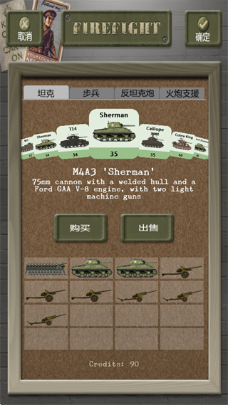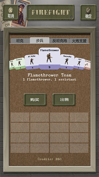 3、进入装备采购阶段,选择所需的士兵、坦克等作战单位,选购完毕点击确定。