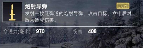 炮射导弹属于武器技能,可发射一枚低弹道导弹攻击敌人,穿深达九百七十毫米,标准伤害为四百零八点;低弹道特性使其无法越过掩体攻击,对地形条件有一定要求。