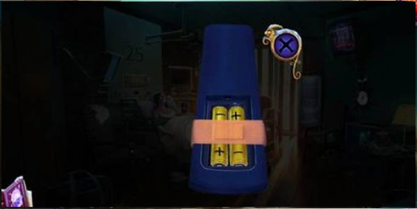 3、完成振颤器操作后,点击墙上时钟取下电池,接着点击桌子,取得剧情本与遥控器,并关闭灯光。