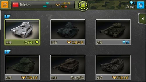 4、把箭鱼坦克升级到满级后,完全可以用到游戏中期,不建议新手前期消耗20钻石购买天龙坦克;