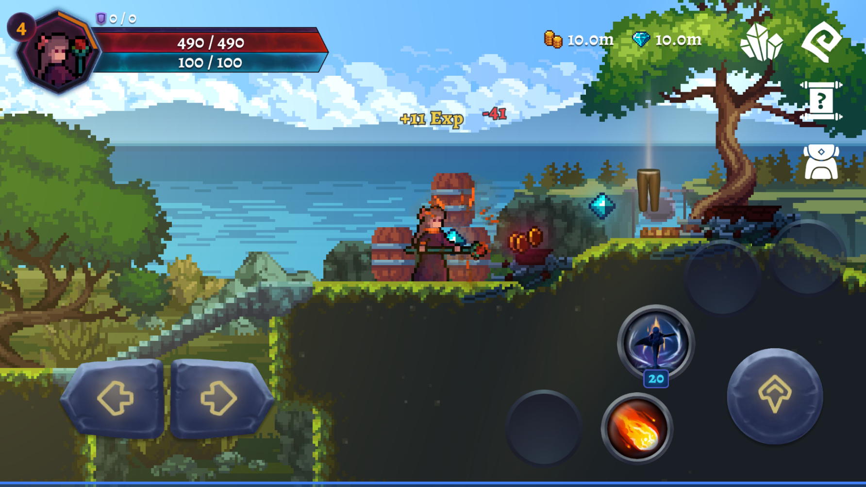2、遭遇敌人时,灵活组合移动、跳跃与技能按键将其消灭,击败后可获得金币与钻石;