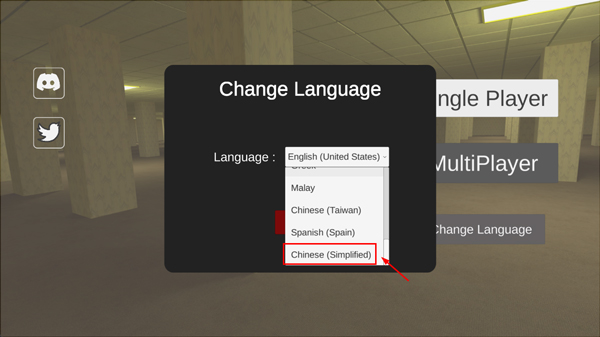1、进入游戏后,若界面语言非中文,请找到并点击“Change Language”按钮。