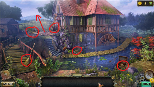 3、水车前的水面,用扫帚清理树枝杂物,找到木勺。