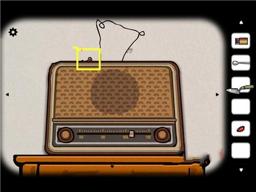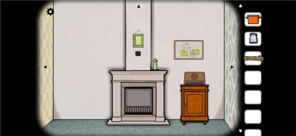 来到下一个场景,壁炉上摆着蜡烛和相框。一旁上锁的柜子旁,有台收音机和告示板。