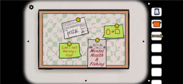 告示板上的字条提供信息:“我可以吃哈维下的蛋吗?”;“百忧解10毫克(一种精神药物)”;精神健康钓鱼中心的传单,提示用哈维的蛋换取方块。