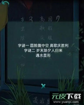 2、在右下红布处找到【金杯】,拨开墓碑下方草丛看到线索【遇水显形】;用金杯在左侧盛水泼向墓碑,显现出两个字谜。
