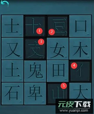 3、在前方石洞右下角挪开石头,发现一处机关,密码设置为【十、豆、支、亻、山】,解开后获得鼓女名册。
