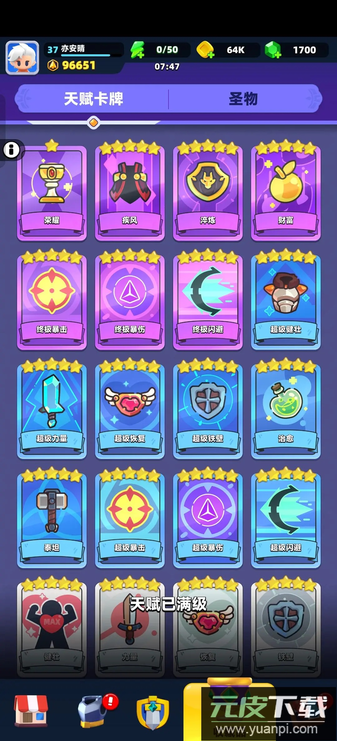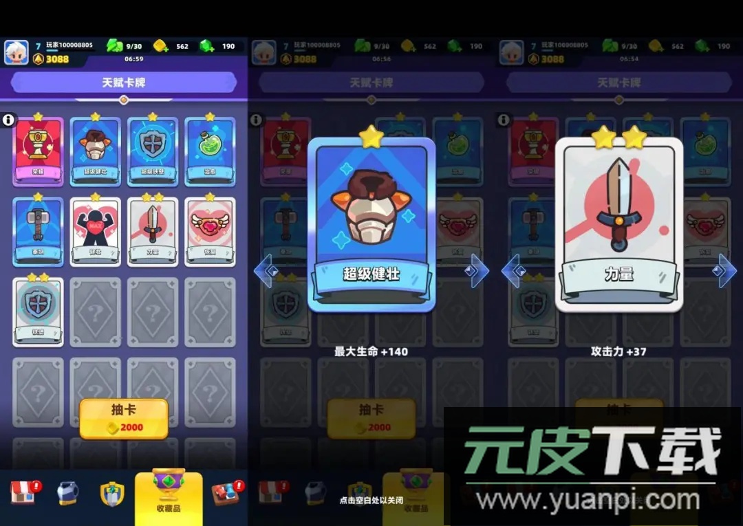 消耗金币抽取天赋卡牌即可获得各类属性加成。相同卡牌可合并升级,从而获取更强的加成效果。