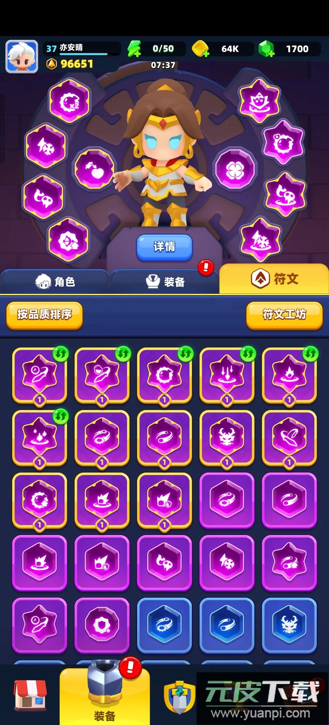 符文共十种,分为三类:增强符文主加攻击,能力符文主加生命,祝福符文同时提升攻击与生命。符文品质与装备一致,达到紫色后可激活特殊效果,例如复活、技能概率提升、伤害增益等,玩家可根据战斗风格自由搭配。