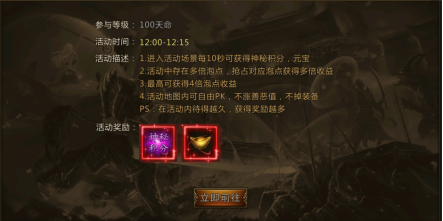 每天中午12:00 - 12:15,游戏会限时开放激情泡点活动,活动期间所有天命等级达到100级以上的玩家,都可以报名参与。活动产出的神秘积分,是兑换铭文材料的专属道具,想要升级铭文的玩家,一定要在活动中尽可能多拿奖励。
