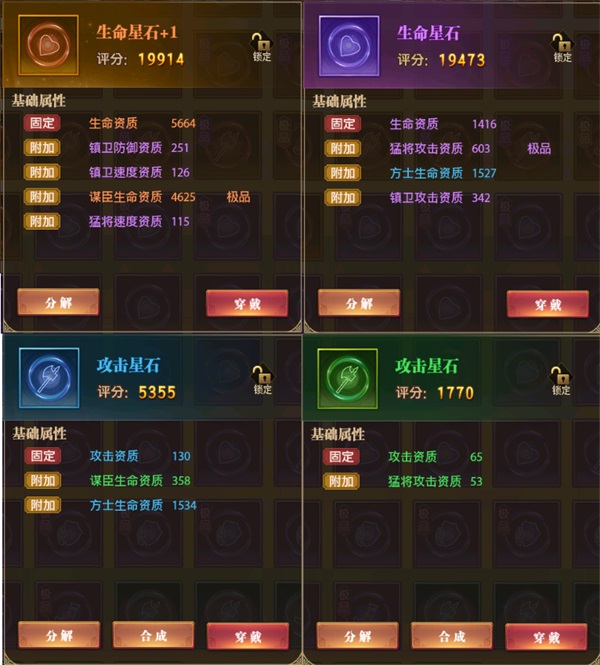 橙色星石:附带四条额外属性,包括一条橙色属性和三条紫色属性;