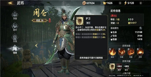 天赋技能可给主将加2%防御,是非常合格的副将人选,大招覆盖范围广,伤害表现也很不错,同样值得投入资源培养;周仓的走路姿势是当前游戏内最有特点的,魔性十足趣味拉满。