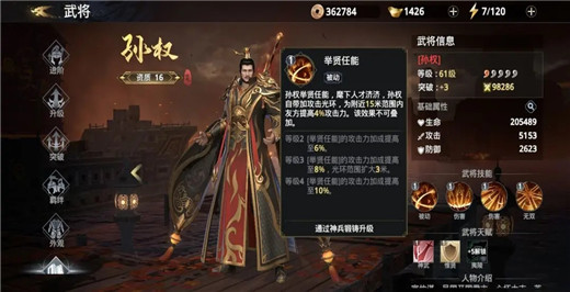 和上面几位武将一样,孙权本身天赋不会给主将加百分比属性,但是在势力战、后期团战活动中,孙权可凭借被动技能给友方提升4%攻击力,是团战必备的辅助类武将,值得投入资源培养。