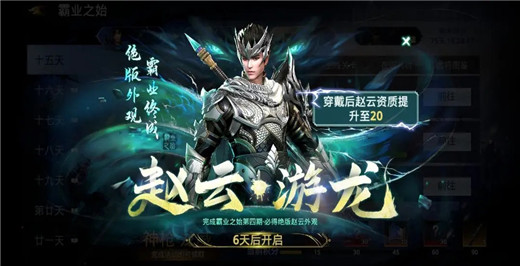18资质赵云,完成新手活动即可获得一个,做完霸业之史活动还能免费升级为20资质金将