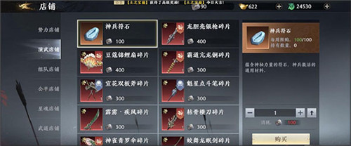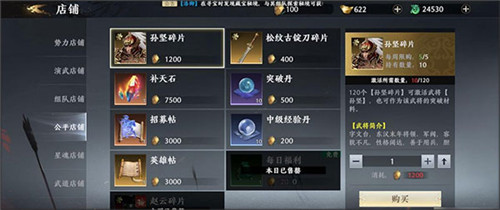 演武店铺:不要兑换符石,符石只用来升级红色品质装备就不会出现资源缺口,武将碎片可偶尔用来补充升阶需求,优先购买赵云武器碎片。千万不要盲目用符石升级橙将武器,后续大概率会出现资源短缺的情况;