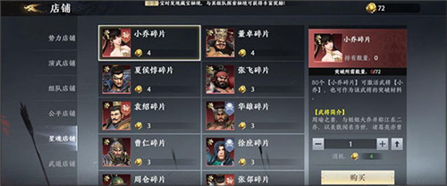 星魂店铺:这是抽卡相关的核心商店,打算存孙坚的玩家可以每周买满十个孙坚碎片,多余的碎片可以偶尔用来补充武将升阶需求,开区第一天想要冲战力的可以用重复的夏侯或者董卓升几阶,高阶武将需要的碎片数量太多,不建议主兑换单个武将,以补充升阶碎片为核心选择;