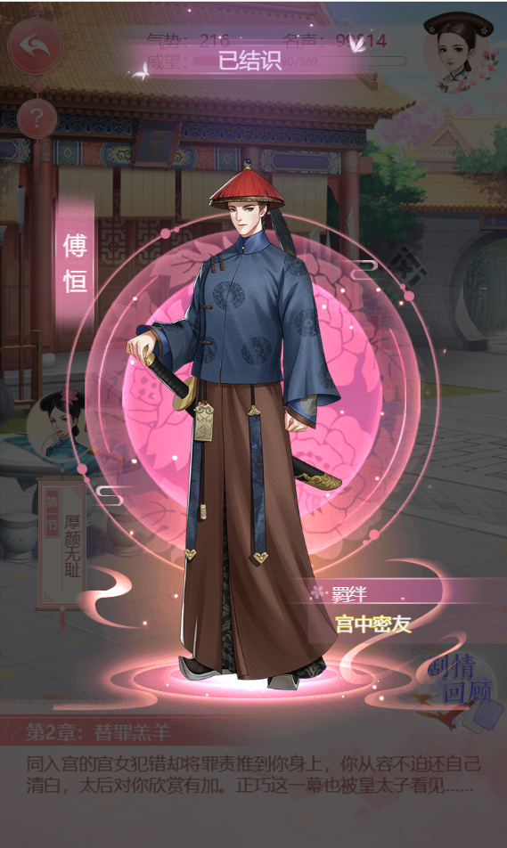 4. 通关剧情“初入宫廷”后,即可解锁知己系统。一段英雄救美的邂逅,让暖心侍卫傅恒开始陪伴你的宫廷生活。