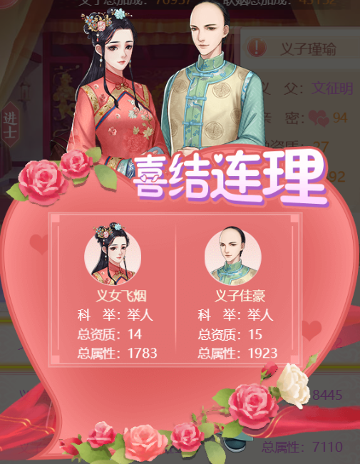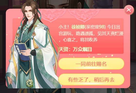 6. 与知己互动时,有机会偶遇遗孤,并将其收为义子女。你可以在凤光殿的义子界面进行查看与教导。待其成年后,可参与科举考取功名,之后便能与其他玩家的义子女缔结婚缘。