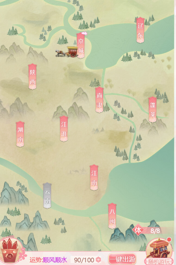 界面右下角显示当前体力值,选择随机游玩将进入已解锁区域,途中可能触发各种奇遇,例如巧遇知己、酒楼听书、机智辩答等。完成这些事件有机会获得稀有道具、珍宝典籍,甚至结识新的知己。
