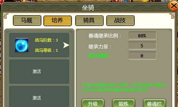 新系统包含马厩、培养、骑具、战技四个界面,所有已获得坐骑均可收纳于马厩中。