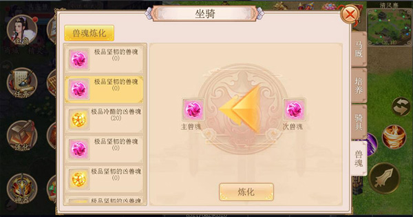 兽魂需融合至战马或兽魂槽方能生效,玩家获得的实际属性加成为兽魂属性乘以所融合部位的继承比例。通过培养战马与兽魂槽提升继承比例,可获得更多属性。战马本身与三个兽魂槽共计可融合四个兽魂。