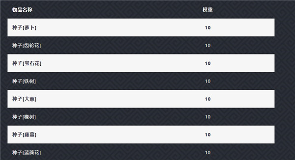 其他掉落物分为三个等级,各等级包含多种材料、蓝图与种子;抽取到其他掉落物时,系统会先随机选定一个等级,再确定掉落物种类,最后根据该类物品的权重分配具体物品。若该等级掉落池中存在玩家未获取的蓝图,则获得蓝图、种子、材料的概率依次为30%、35%、35%;若该等级所有蓝图均已获得,则获得种子与材料的概率各为50%,蓝图概率为0。特定掉落物的获取概率计算公式如下: