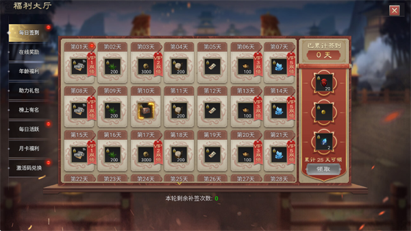 4、每日签到、在线奖励均可领取,累计签到天数更能获得多样回馈;