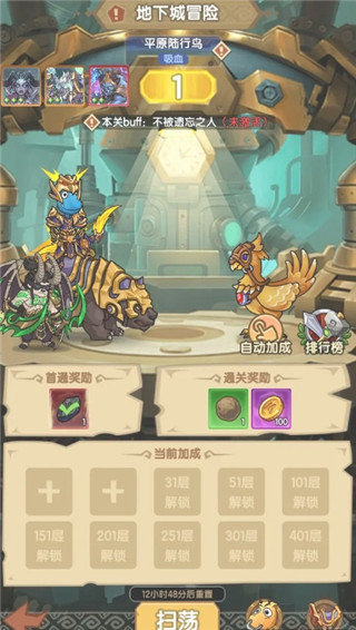 三、重置 1.每天凌晨5点地下城会进行进度重置,挑战进度会回到第一层; 2.通关达到30层后,次日会解锁一键扫荡功能; 3.扫荡功能可以针对历史最高通关记录中20层以前的关卡进行快速扫荡,能直接获取对应层数的挑战成功奖励; 4.扫荡完成后,可以根据通过的层数进行加成选择;