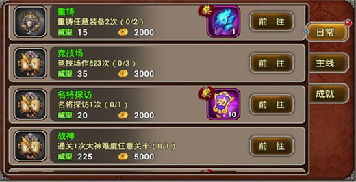 其次就是完成游戏内的各类任务,任务分为日常、主线和成就三类,主线任务跟着等级推进完成即可,日常任务全部做完也能拿到不少威望,建议大家每天都要清完日常任务。