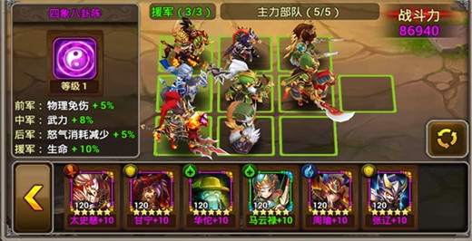 主力阵容选择黄忠、关羽、曹操、刘备、诸葛亮,援军选择张飞、赵云、吕布,阵法搭配四象八卦阵。