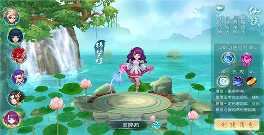 1. 进入游戏后,玩家可从人、妖、仙三族中选择心仪的职业,每个种族拥有独特的门派技能,点击右侧技能图标即可查看详情;