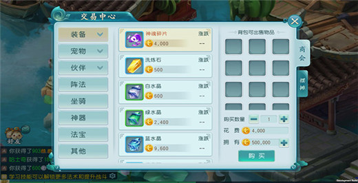 5. 游戏内置自由交易系统,装备、宠物、伙伴、阵法等物品均可在交易中心进行买卖操作。