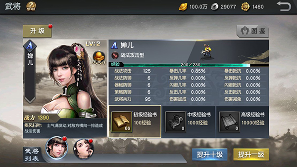 5、在武将管理界面,玩家可以对麾下武将进行升级、进阶等培养操作,从而全面提高队伍的作战效能。