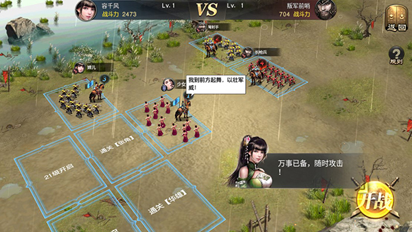 2、在每场战斗开始前,需要合理搭配出战阵容,布置完毕后即可进入战斗,体验策略对决的乐趣。