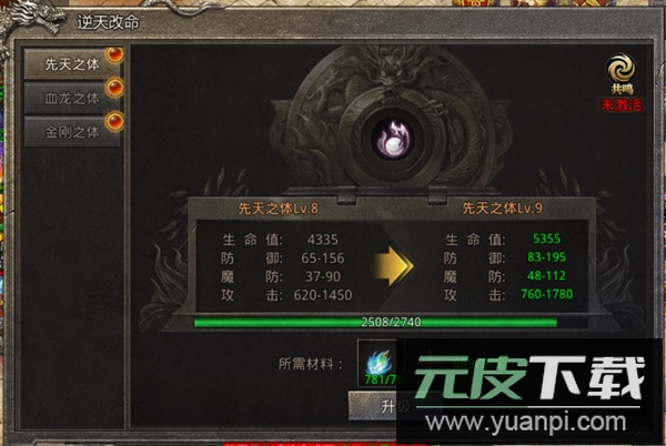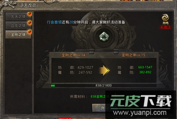 提升需要金刚之体材料与绑定金币,该材料同样来源于闯天关与黑市;升级后可显著增强角色的物理防御与魔法防御能力。