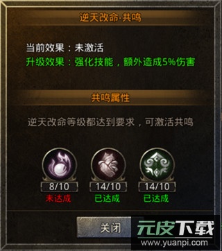 当所有逆天改命项目均达到10级,即可激活共鸣效果;共鸣等级提升能强化技能威力,额外附加5%的伤害输出。